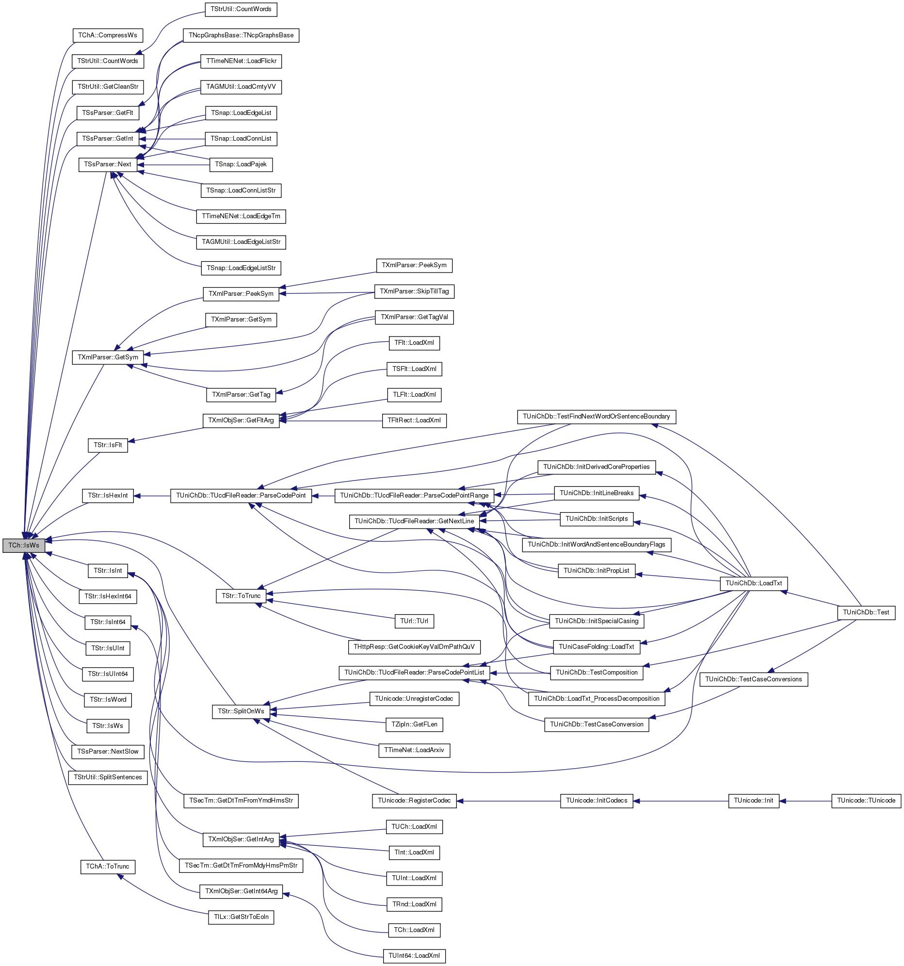 Referenced by TChA::CompressWs(), TStrUtil::CountWords(), TStrUtil::GetCleanStr(), TSsParser::GetFlt(), TSsParser::GetInt(), TXmlParser::GetSym(), TStr::IsFlt(), TStr::IsHexInt(), TStr::IsHexInt64(), TStr::IsInt(), TStr::IsInt64(), TStr::IsUInt(), TStr::IsUInt64(), TStr::IsWord(), TStr::IsWs(), TSsParser::Next(), TSsParser::NextSlow(), TStr::SplitOnWs(), TStrUtil::SplitSentences(), TChA::ToTrunc(), and TStr::ToTrunc().