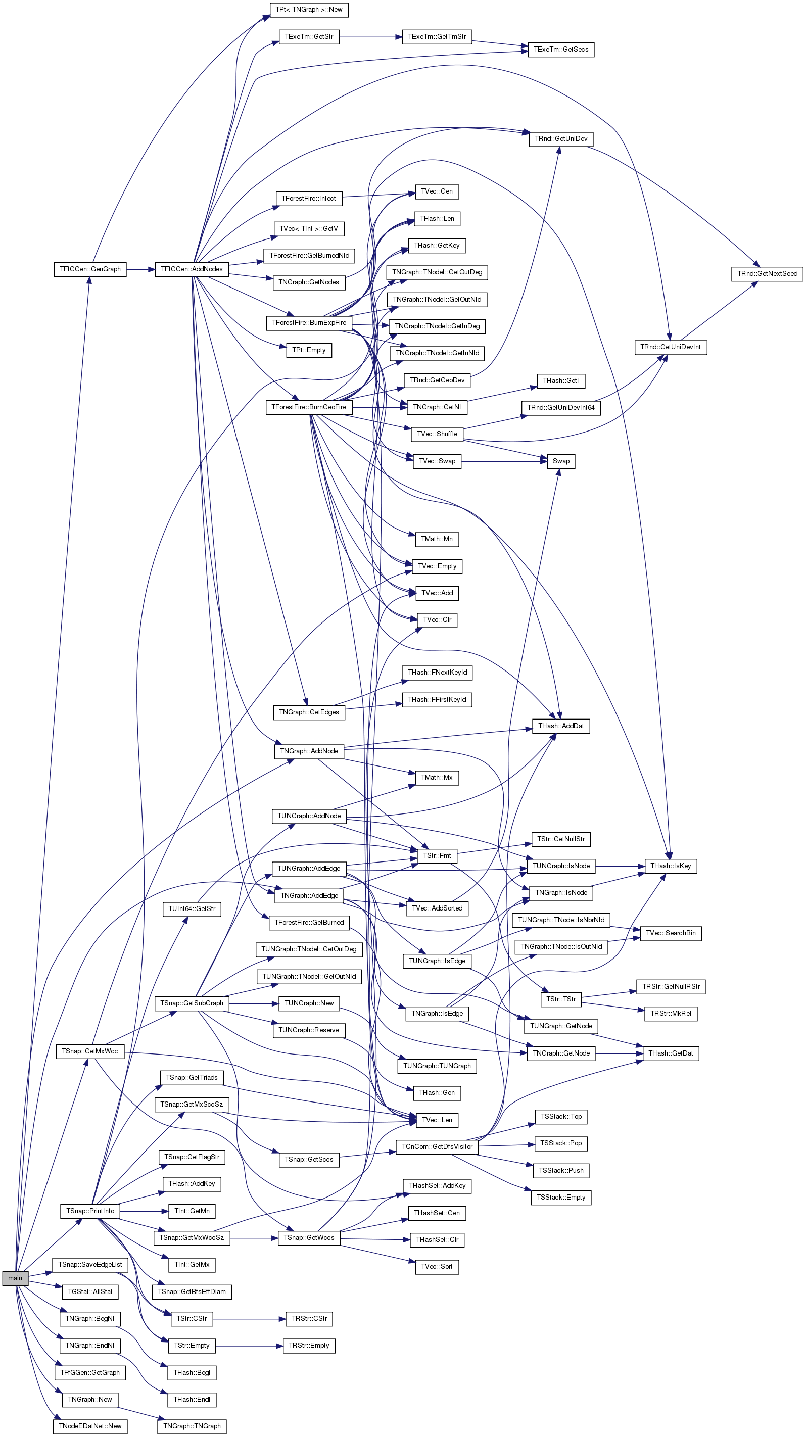 References TNGraph::AddEdge(), TNGraph::AddNode(), TGStat::AllStat(), TNGraph::BegNI(), TNGraph::EndNI(), TFfGGen::GenGraph(), TFfGGen::GetGraph(), TSnap::GetMxWcc(), TNGraph::New(), TNodeEDatNet< TNodeData, TEdgeData >::New(), TSnap::PrintInfo(), TInt::Rnd, and TSnap::SaveEdgeList().