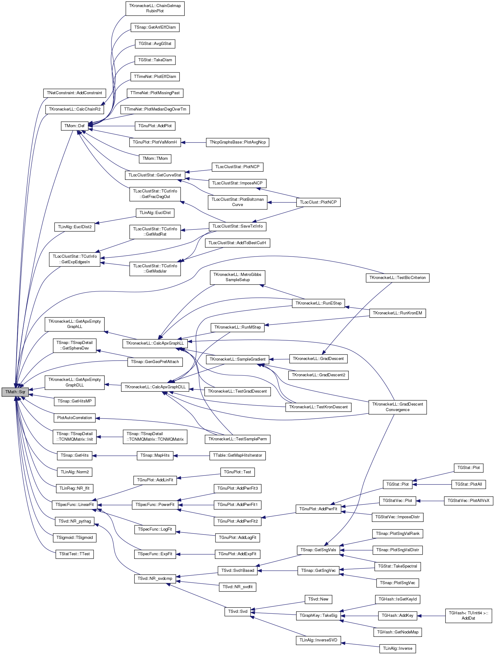 Referenced by TNetConstraint< PGraph >::AddConstraint(), TKroneckerLL::CalcChainR2(), TMom::Def(), TLinAlg::EuclDist2(), TSnap::GenGeoPrefAttach(), TKroneckerLL::GetApxEmptyGraphDLL(), TKroneckerLL::GetApxEmptyGraphLL(), TLocClustStat::TCutInfo::GetExpEdgesIn(), TSnap::GetHits(), TSnap::GetHitsMP(), TSnap::TSnapDetail::GetSphereDev(), TSnap::TSnapDetail::TCNMQMatrix::Init(), TSpecFunc::LinearFit(), TLinAlg::Norm2(), TLinReg::NR_lfit(), TSvd::NR_pythag(), PlotAutoCorrelation(), TKroneckerLL::TestBicCriterion(), TSigmoid::TSigmoid(), and TStatTest::TTest().