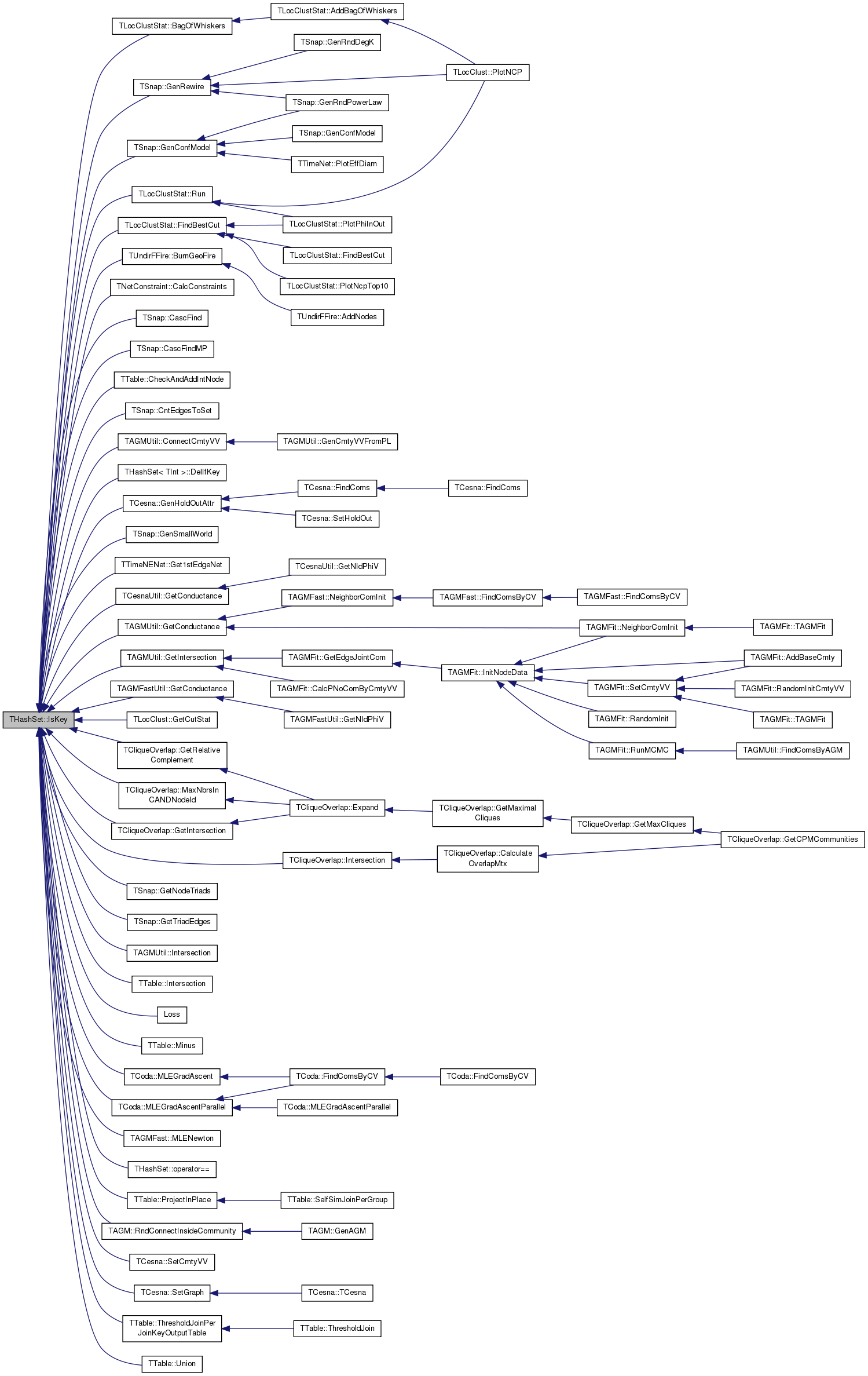 Referenced by TLocClustStat::BagOfWhiskers(), TUndirFFire::BurnGeoFire(), TNetConstraint< PGraph >::CalcConstraints(), TSnap::CascFind(), TSnap::CascFindMP(), TTable::CheckAndAddIntNode(), TSnap::CntEdgesToSet(), TAGMUtil::ConnectCmtyVV(), THashSet< TInt >::DelIfKey(), TLocClustStat::FindBestCut(), TSnap::GenConfModel(), TCesna::GenHoldOutAttr(), TSnap::GenRewire(), TSnap::GenSmallWorld(), TTimeNENet::Get1stEdgeNet(), TCesnaUtil::GetConductance(), TAGMUtil::GetConductance(), TAGMFastUtil::GetConductance(), TLocClust::GetCutStat(), TCliqueOverlap::GetIntersection(), TAGMUtil::GetIntersection(), TSnap::GetNodeTriads(), TCliqueOverlap::GetRelativeComplement(), TSnap::GetTriadEdges(), TCliqueOverlap::Intersection(), TAGMUtil::Intersection(), TTable::Intersection(), Loss(), TCliqueOverlap::MaxNbrsInCANDNodeId(), TTable::Minus(), TCoda::MLEGradAscent(), TCoda::MLEGradAscentParallel(), TAGMFast::MLENewton(), THashSet< TKey, THashFunc >::operator==(), TTable::ProjectInPlace(), TAGM::RndConnectInsideCommunity(), TLocClustStat::Run(), TCesna::SetCmtyVV(), TCesna::SetGraph(), TTable::ThresholdJoinPerJoinKeyOutputTable(), and TTable::Union().