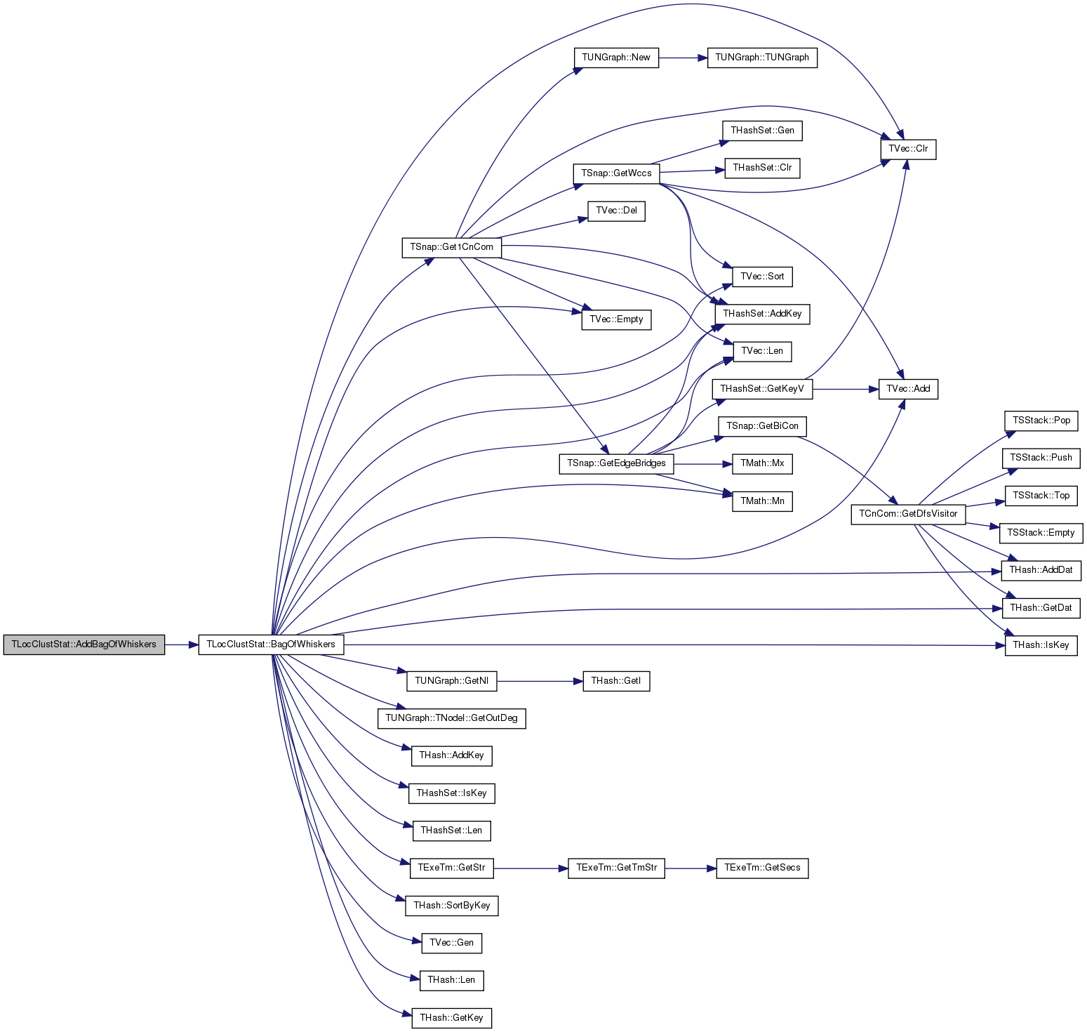 References THashSet< TKey, THashFunc >::AddKey(), Alpha, BestCut, BestCutH, TLocClust::BestCutNodes(), BinFactor, Clr(), TVec< TVal, TSizeTy >::Clr(), THashSet< TKey, THashFunc >::Clr(), Coverage, TLocClustStat::TCutInfo::CutNIdV, TLocClustStat::TCutInfo::CutSz, TLocClustStat::TCutInfo::Edges, THashSet< TKey, THashFunc >::Empty(), TLocClust::FindBestCut(), TExeTm::GetCurTm(), TLocClust::GetCut(), TLocClust::GetCutPhi(), TLocClust::GetCutVol(), TUNGraph::GetEdges(), TSnap::GetMxWcc(), TLocClust::GetNIdV(), TUNGraph::GetNodes(), TLocClust::GetPhi(), TLocClust::GetPhiV(), TUNGraph::GetRndNId(), TExeTm::GetStr(), TVec< TVal, TSizeTy >::GetSubValV(), TLocClust::GetVol(), Graph, IAssert, THashSet< TKey, THashFunc >::IsKey(), KFac, KMax, KMin, TLocClust::Len(), Mega, TFlt::Mx, TMath::Round(), SizeBucketSet, SizeFrac, SizePhiH, SweepsV, TExeTm::Tick(), and TLocClust::Verbose.