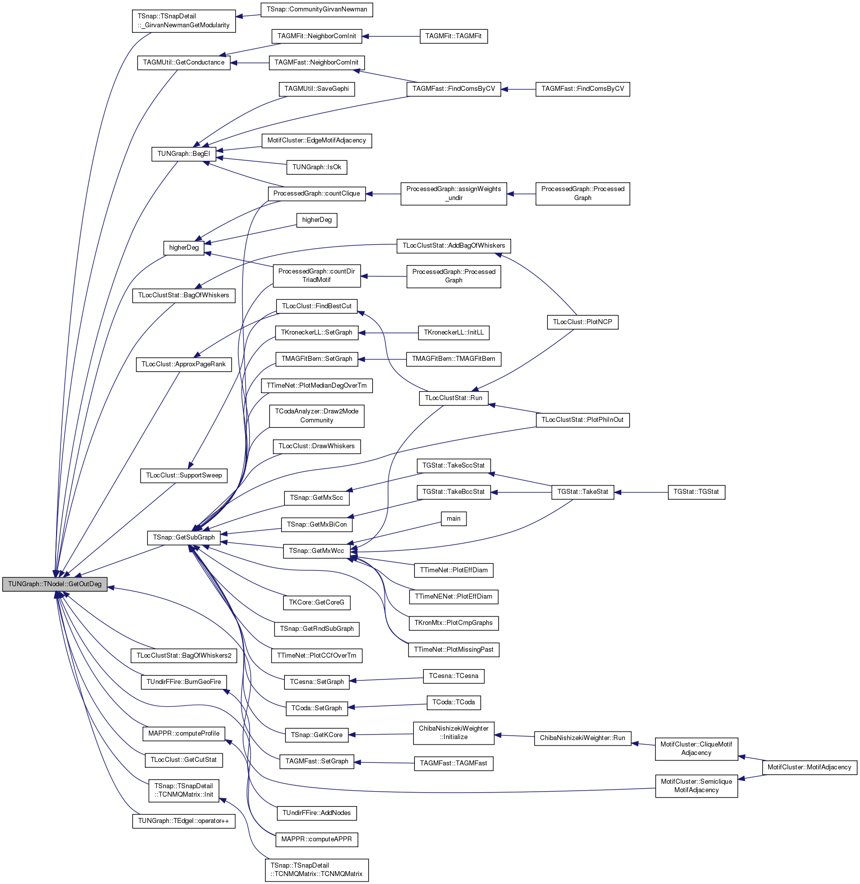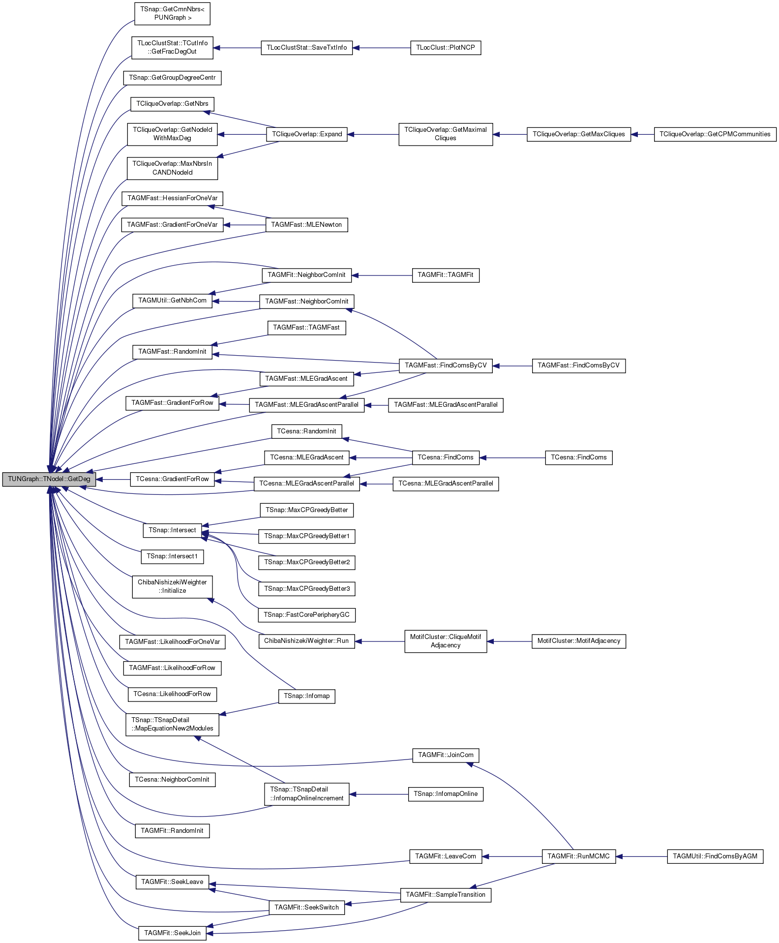 Referenced by TSnap::GetCmnNbrs< PUNGraph >(), TLocClustStat::TCutInfo::GetFracDegOut(), TSnap::GetGroupDegreeCentr(), TAGMUtil::GetNbhCom(), TCliqueOverlap::GetNbrs(), TAGMFast::GradientForOneVar(), TAGMFast::GradientForRow(), TCesna::GradientForRow(), TAGMFast::HessianForOneVar(), TSnap::Infomap(), TSnap::TSnapDetail::InfomapOnlineIncrement(), ChibaNishizekiWeighter::Initialize(), TSnap::Intersect(), TSnap::Intersect1(), TAGMFit::JoinCom(), TAGMFit::LeaveCom(), TAGMFast::LikelihoodForOneVar(), TAGMFast::LikelihoodForRow(), TCesna::LikelihoodForRow(), TSnap::TSnapDetail::MapEquationNew2Modules(), TCliqueOverlap::MaxNbrsInCANDNodeId(), TAGMFast::MLEGradAscent(), TAGMFast::MLEGradAscentParallel(), TCesna::MLEGradAscentParallel(), TAGMFast::MLENewton(), TAGMFast::NeighborComInit(), TAGMFit::NeighborComInit(), TCesna::NeighborComInit(), TAGMFit::RandomInit(), TAGMFit::SeekJoin(), TAGMFit::SeekLeave(), TAGMFit::SeekSwitch(), and MotifCluster::SemicliqueMotifAdjacency().