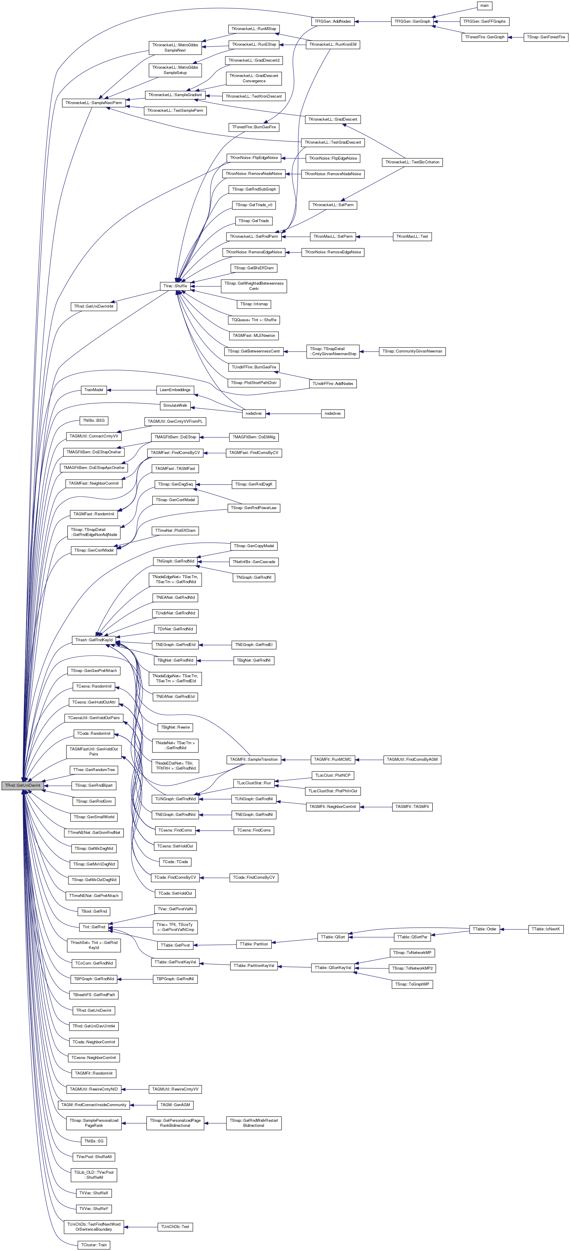 Referenced by TFfGGen::AddNodes(), TUndirFFire::AddNodes(), TNIBs::BSG(), TAGMUtil::ConnectCmtyVV(), TMAGFitBern::DoEStepApxOneIter(), TMAGFitBern::DoEStepOneIter(), TAGMFast::FindComsByCV(), TKronNoise::FlipEdgeNoise(), TSnap::GenConfModel(), TSnap::GenCopyModel(), TSnap::GenGeoPrefAttach(), TCesna::GenHoldOutAttr(), TCesnaUtil::GenHoldOutPairs(), TAGMFastUtil::GenHoldOutPairs(), TTree< TVal >::GenRandomTree(), TSnap::GenRndBipart(), TSnap::GenRndGnm(), TSnap::GenSmallWorld(), TTimeNENet::GetGnmRndNet(), TSnap::GetMxDegNId(), TSnap::GetMxInDegNId(), TSnap::GetMxOutDegNId(), TTimeNENet::GetPrefAttach(), TBool::GetRnd(), TInt::GetRnd(), TSnap::TSnapDetail::GetRndEdgeNonAdjNode(), THash< TKey, TDat, THashFunc >::GetRndKeyId(), THashSet< TInt >::GetRndKeyId(), TCnCom::GetRndNId(), TBPGraph::GetRndNId(), TBreathFS< PGraph >::GetRndPath(), GetUniDevInt(), GetUniDevInt64(), GetUniDevUInt64(), TKroneckerLL::MetroGibbsSampleNext(), TAGMFast::NeighborComInit(), TCoda::NeighborComInit(), TCesna::NeighborComInit(), TAGMFast::RandomInit(), TCoda::RandomInit(), TAGMFit::RandomInit(), TCesna::RandomInit(), TAGMUtil::RewireCmtyNID(), TAGM::RndConnectInsideCommunity(), TKroneckerLL::SampleNextPerm(), TSnap::SamplePersonalizedPageRank(), TAGMFit::SampleTransition(), TNIBs::SG(), TVec< TVal, TSizeTy >::Shuffle(), TVecPool< TVal, TSizeTy >::ShuffleAll(), TGLib_OLD::TVecPool< TVal >::ShuffleAll(), TVVec< TVal, TSizeTy >::ShuffleX(), TVVec< TVal, TSizeTy >::ShuffleY(), SimulateWalk(), TUniChDb::TestFindNextWordOrSentenceBoundary(), TCluster::Train(), and TrainModel().